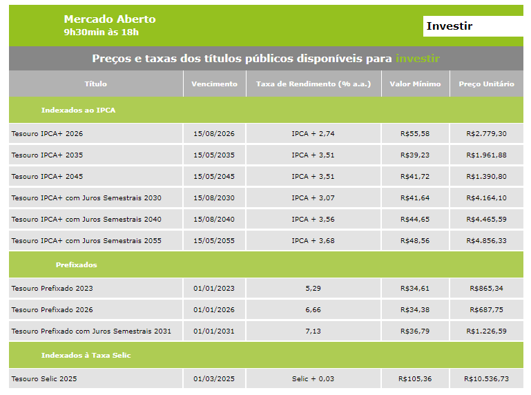 Confira, a seguir, os preços e as taxas dos títulos antes da suspensão das negociações: