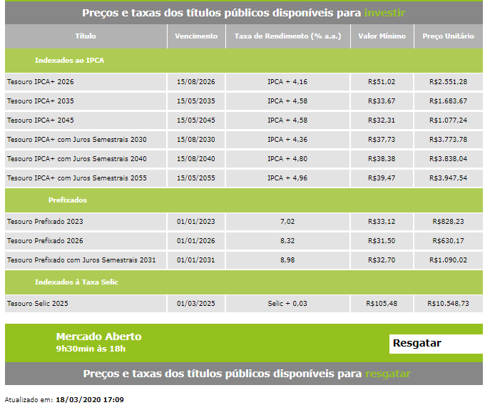 Confira os preços e as taxas dos títulos públicos ofertados nesta quarta-feira (18):