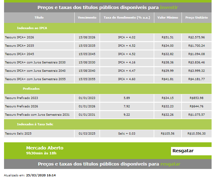 Confira os preços e as taxas dos títulos públicos ofertados nesta quarta-feira (25):