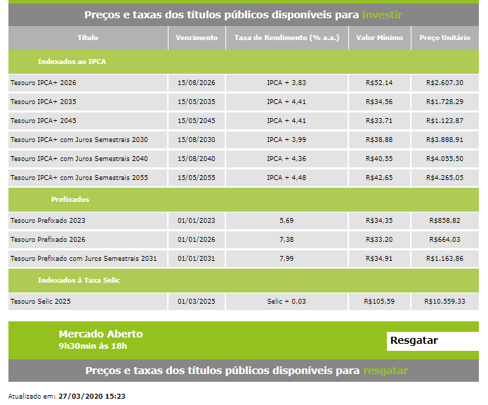 SÃO PAULO – Com investidores avaliando o impacto das medidas de socorro dos governos e o aumento da extensão da pandemia do coronavírus, com o novo epicentro nos Estados Unidos, as taxas dos títulos públicos negociados via Tesouro Direto operavam sem movimento definido na tarde desta sexta-feira (27).