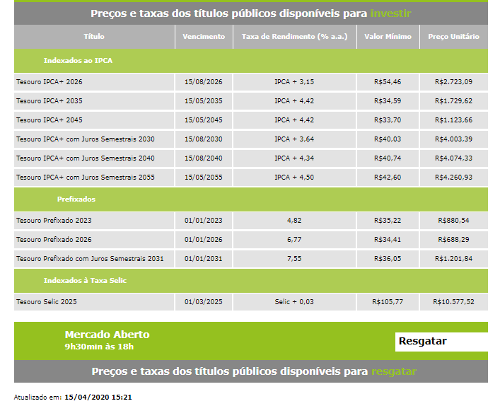 SÃO PAULO – Em mais um dia pautado pela cautela, com investidores de olho nas notícias sobre o coronavírus ao redor do mundo e repercutindo dados dos Estados Unidos, as taxas de títulos públicos negociados via Tesouro Direto, operam em queda na tarde desta quarta-feira (15).