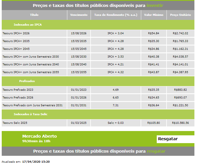 SÃO PAULO – Em um dia de maior alívio nos mercados, com o anúncio de reabertura da economia americana a partir de maio, as taxas dos títulos públicos indexados à inflação e negociados via Tesouro Direto apresentavam queda na tarde desta sexta-feira (17).